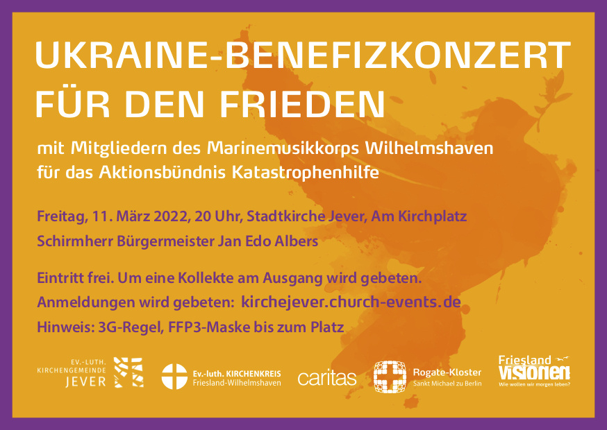 Zu einem „Ukraine-Benefizkonzert für den Frieden“ wird am Freitag, 11. März 2022, in die Stadtkirche Jever (Am Kirchplatz) eingeladen. Mitglieder des Marinemusikkorps Wilhelmshaven werden Werke verschiedener Komponisten spielen.