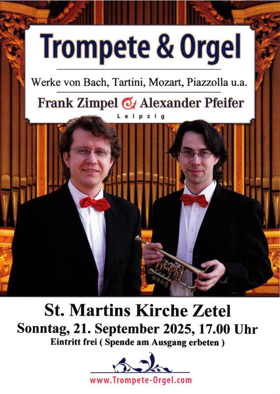 Am Sonntag, dem 21. September musiziert das Leipziger "Duo Presto“, Alexander Pfeifer (Trompete) und Frank Zimpel (Orgel) um 17.00 Uhr in der St. Martins-Kirche zu Zetel.