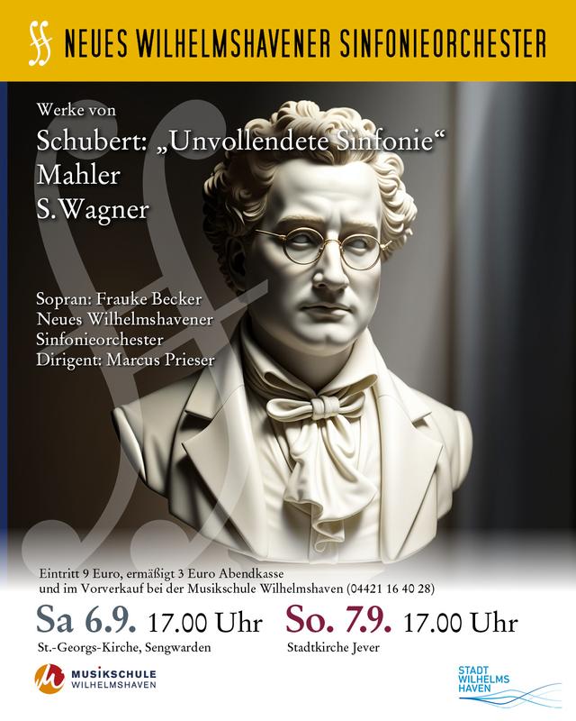 In der zweiten Konzerthälfte erklingt eines der bekanntesten und schönsten Meisterwerke der klassischen Musik, Schuberts Sinfonie Nr.7 h-Moll, die „Unvollendete“. So wird es auch in diesem Programm des Orchesters neben Bekanntem wieder einmal vieles zu entdecken geben. Marcus Prieser wird nicht nur dirigieren, sondern auch wie gewohnt durch das Programm führen. Das Konzert findet am Samstag den 6. September um 17 Uhr in der St. Georg Kirche Sengwarden statt und wird am Sonntag den 7. September um 17 Uhr in der Stadtkirche Jever wiederholt.