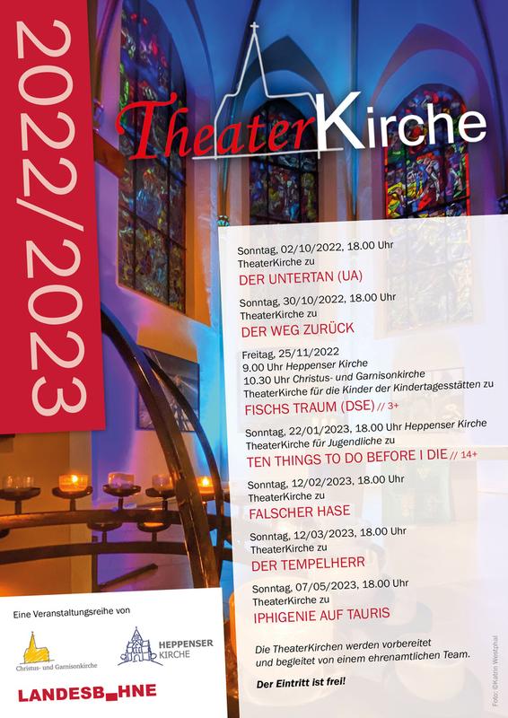 Die Theaterkirche am 02. Oktober 2022 um 18 Uhr wird gestaltet von Pastor Rainer Claus, dem Ensemble der Landesbühne und dem Team der Theaterkirche.